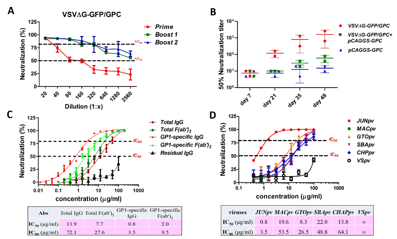 依据以上方法,本研究成功制备了对致病性新世界沙粒病毒具有广谱作用的马抗血清和其衍生产物,相关方法和所得抗体及其应用已申请专利。本研究所呈现的马抗血清制备策略,对开发烈性病毒的马抗血清及其衍生抗体产品具有示范作用;所得的马抗血清衍生抗体,对我国防控输入性阿根廷出血热等南美地区出血热具有潜在用途。