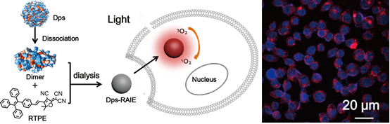 蛋白质是生物两性分子,具有良好的生物相容性、生物可降解性和多种功能化位点,在AIE纳米颗粒的制备中作为支架或模板具有很大的潜力。病毒学国家重点实验室李峰研究员课题组长期从事病毒材料/蛋白质与纳米材料交叉研究。近期该团队以带强负电荷的迷你铁蛋白(Dps)为支架,发展了一种新型的AIE纳米点(Dps-RAIE nanodots)制备方法,并用于细胞成像。其所制备的AIE纳米点具有尺寸均匀(平均粒径26 nm)、发射波长长(峰值约670 nm)、量子产率高、稳定性好和暗细胞毒性低等特点。此外,该探针还可在白光照射下产生单线氧,可作为一种新型的荧光成像和光动力治疗双模式探针。
