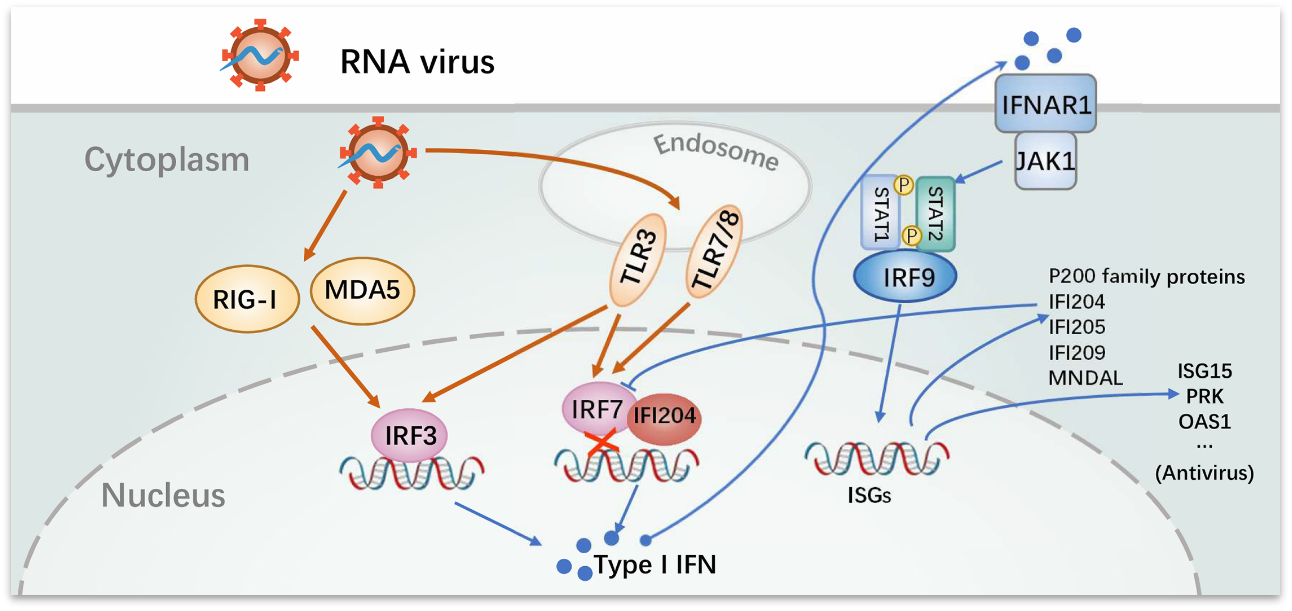 图2. P200家族蛋白负调控IRF7介导的I型干扰素反应示意图。RNA病毒感染后期,被诱导高表达的P200家族蛋白通过结合IRF7进而抑制其下游的基因转录。