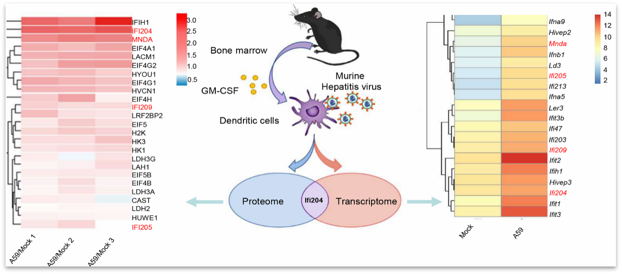 在以往的研究报道中,以AIM2、IFI16为代表的P200家族蛋白通过识别病毒DNA来激活下游I型干扰素和炎症反应。在本研究中,作者通过蛋白质组和转录组联合分析,发现在DNA或RNA病毒感染小鼠骨髓来源树突状细胞(BMDCs)后,P200家族蛋白IFI204(IFI16的鼠同源蛋白)被激活,表达水平显著提高(图1)。
