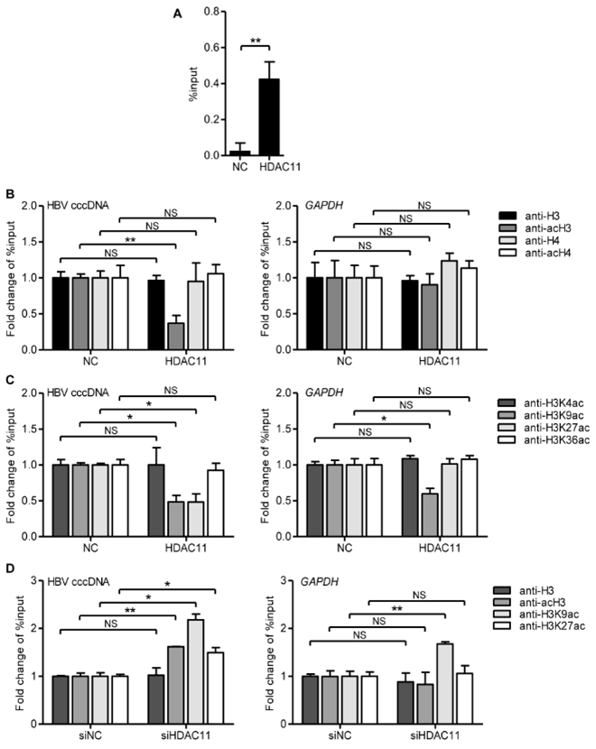 图示2:HDAC11可被招募到cccDNA上并特异性下调H3的乙酰化