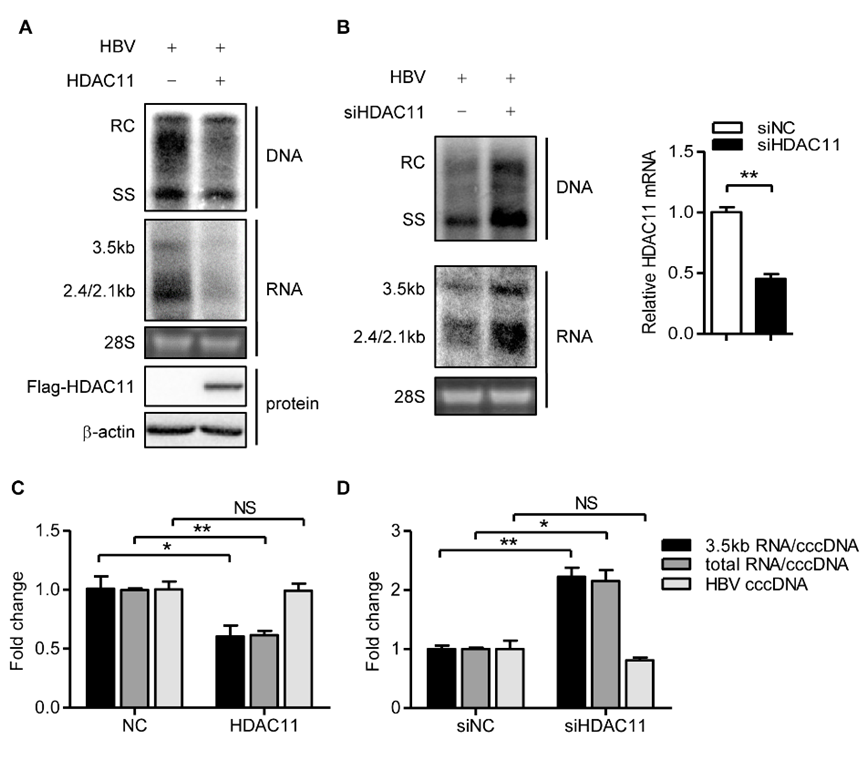 图示1:HBV体外感染体系下HDAC11对HBV转录和复制的影响