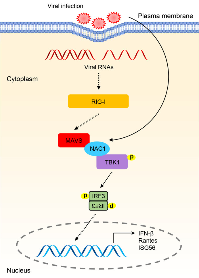 图示:NAC1通过桥接MAVS和TBK1增强细胞抗病毒通路示意图