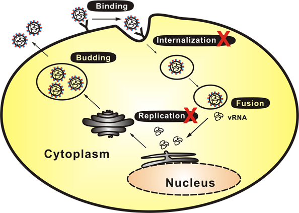 图示:钙离子通道抑制剂抑制SFTSV病毒内化及基因组复制