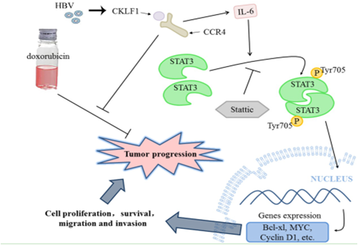 在朱帆教授的指导下,博士研究生柳又祎发现并证实人趋化素样因子1(CKLF1)是炎癌转化过程中的一种重要的趋化因子。课题组发现CKLF1能被HBV上调,在HBV相关HCC组织中明显高表达,并与原发性肝细胞癌的进程及不良预后密切相关。进一步研究发现CKLF1能通过IL-6/STAT3信号通路抑制经典抗癌药物多柔比星对肝癌细胞的凋亡作用。该研究揭示了CKLF1在HBV相关HCC中所扮演的重要角色,为CKLF1在HBV炎癌转化过程的机制研究打下了基础,为HCC的耐药性研究及靶向治疗提供了新的思路。