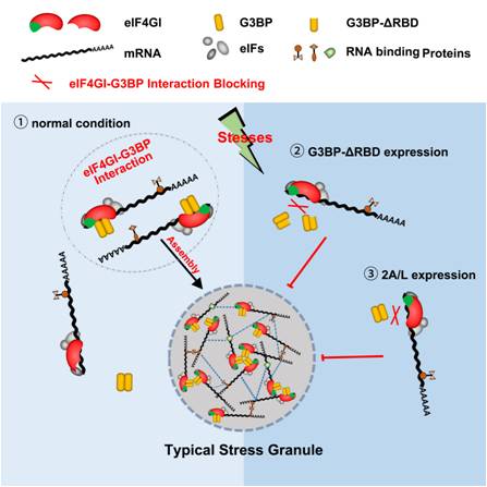 图示:eIF4GI-G3BP相互作用调节及2A拮抗tSGs形成示意图