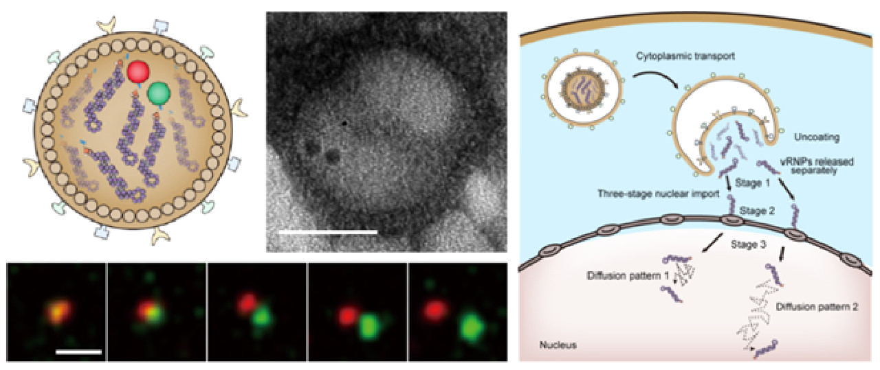 该团队首先建立了量子点位点特异性标记甲型流感病毒基因组技术。在病毒感染过程中,病毒核糖核蛋白复合物(vRNP)顶端的聚合酶蛋白PA被可控生物素化,与链霉亲和素修饰的量子点特异性结合,并组装进入成熟的子代病毒粒子,从而获得基因组被量子点标记的流感病毒。基于量子点的高亮度和耐光漂白等特点,利用单颗粒示踪技术,结合病毒包膜和细胞组分荧光标记,对单颗流感病毒感染宿主细胞时的脱壳过程进行实时动态可视化分析。实时动态揭示了流感病毒在感染后30-90分钟,病毒由早期内体进入晚期内体发生膜融合、基因组与病毒包膜分离、单个节段基因从晚期内体中分别释放、解离释放的单个节段基因入核、及其在细胞核内运输的动态过程。发现流感病毒八个vRNP在脱壳过程中以单独而非组团的方式从晚期内体中释放进入细胞质,这些单独的vRNP以特征性三阶段主动运输机制进入细胞核,入核后的vRNP以两种不同的扩散模式运输到其复制/转录位点等重要过程与机制。