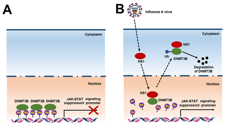 DNA 甲基化是指 DNA 甲基化转移酶(DNAmethyltransferase,DNMT)催化转移S-腺苷甲硫氨酸(SAM)提供的甲基到胞嘧啶和鸟嘌呤(CpG)二核苷酸的胞嘧啶中第5位碳原子上。DNMT在哺乳动物细胞中已知有活性的有四种,分别是DNMT1、DNMT3A、DNMT3B及DNMT3L。非结构蛋白1(NS1)被认为是流感病毒的一个重要毒力因子。目前尚无研究报道NS1蛋白与DNMT之间的关系。朱应、刘实团队前期研究工作发现流感病毒通过DNMT调控IL-32的表达(Journal of Immunology 2010;185: 5056–5065)。随后该团队进一步揭示流感病毒通过DNMT调控Cox-2和Ⅲ型干扰素表达(Journal of Virology 2012; 86(2):1010-1020)。该研究在前期研究工作的基础上,发现流感病毒NS1蛋白结合DNMT3B,并将它带入到细胞质中泛素化降解,导致JAK-STAT信号通路抑制因子家族成员的启动子区去甲基化,最终抑制了JAK-STAT信号通路。该成果为治疗流感病毒感染提供了新的思路。