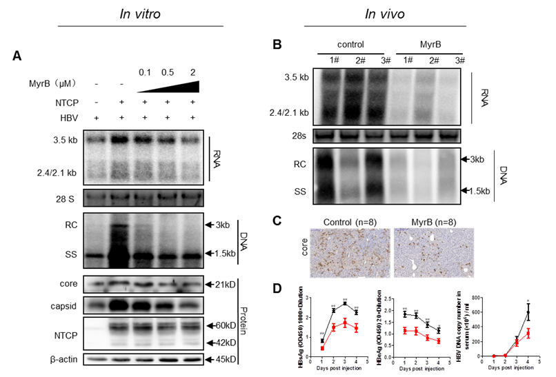 图2. MyrB通过阻断NTCP的胆酸转运抑制由NTCP上调的HBV转录和复制