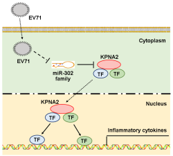 图示:miR-302家族通过KPNA2调控EV71诱导细胞因子表达的示意图