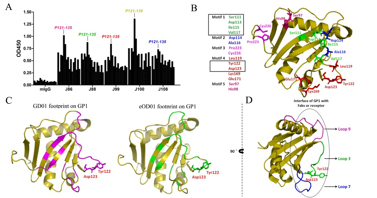 较为特别的是,肖庚富团队获得的这些单抗是研究人员通过对小鼠进行DNA免疫,并通过传统杂交瘤融合和筛选得到。具体为:首先将JUNV包膜糖蛋白GPC全长基因克隆至真核表达载体;随后通过肌肉注射加电击的方式将质粒导入小鼠体内,实现原位表达和免疫;通过传统鼠杂交瘤方式分离脾细胞并培养;最后采用过表达GPC的细胞ELISA来筛选单克隆细胞株和抗体。在此基础上,研究人员通过对分离出来的15株单抗性质进行表征,发现其中5株单抗具有较好中和效果,此结果分别在带有荧光素酶报告基因和GFP报告基因的VSV假病毒上得到验证。且其作用机理均为封闭GP1蛋白,阻止病毒与受体结合,抑制病毒进入细胞。其中,位于GP1 loop 3 上的Tyr122和Asp123被认为是中和抗体与病毒作用的关键位点。