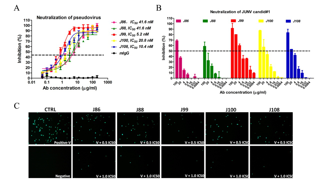 近日,抗病毒药物专业杂志Antiviral Research (抗病毒研究)在线发表了病毒学国家重点实验室肖庚富研究组的最新研究成果,论文题为 “Novel neutralizing monoclonal antibodies against Junin virus”(针对胡宁病毒的新型中和单抗)。该研究获得了针对四级病原胡宁病毒(Junin virus, JUNV)的一系列中和单抗,其中命名为J99的单抗可在体外以0.78 μg/ml的作用浓度抑制50%病毒的感染(IC50=0.78 μg/ml),有望在体内发挥治疗作用。