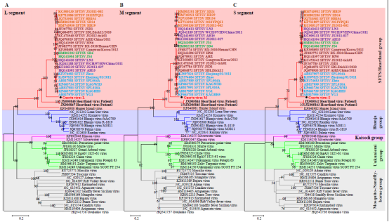 图示:基于白蛉病毒L、M、S三个基因片段的进化分析显示GTV是白蛉病毒的新成员,与SFTSV和HRTV有相近的遗传进化关系