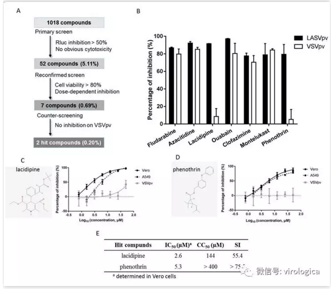 图1:基于FDA药物库筛选得到LASV入侵抑制剂:拉西地平和苯氧司林。