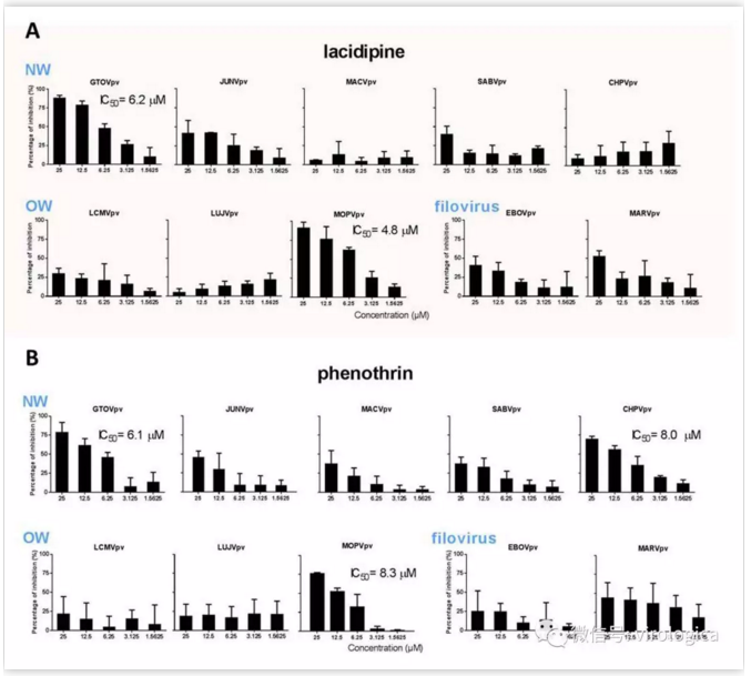 在此基础上,研究人员考察拉西地平和苯氧司林的广谱抗病毒活性,发现拉西地平对于 Mopeia virus(MOPV) 和A级病原 Guanarito virus(GTOV) 也有显著的抑制效果, IC50 分别为 4.8 μM和 6.2 μM; 苯氧司林对于 MOPV、 GTOV 和 Chapare virus(CHPV) 有着显著的抑制作用, IC50 分别为 8.3 μM, 6.1 μM 和 8.0 μM(图2)。