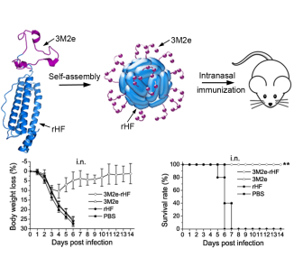 近期,全球多地流感肆虐。接种疫苗是预防流感最有效的途径。但流感病毒有多种亚型,变异快,现有的灭活疫苗需要针对流行毒株变化每年更新。开发广谱性流感疫苗对流感病毒防治具有重要意义。研究人员基于自组装蛋白纳米颗粒展示流感病毒保守抗原表位M2e,构建表面展示M2e串联多肽的3M2e-rHF纳米疫苗。该纳米疫苗经滴鼻途径免疫小鼠,可以诱导产生强烈的体液免疫、细胞免疫、黏膜免疫应答。经该纳米疫苗免疫的小鼠,不仅可以完全抵抗与其3M2e同源的H1N1病毒的致死性感染,也可以抵抗禽流感病毒H9N2的致死性感染。该黏膜疫苗经鼻腔免疫,避免注射途径引起的肌肉损伤,且免疫时不需添加任何佐剂,使用过程更加安全方便。该纳米疫苗提供了疫苗研制新策略,且易于规模化生产,未来有望开发为实用广谱抗流感疫苗。