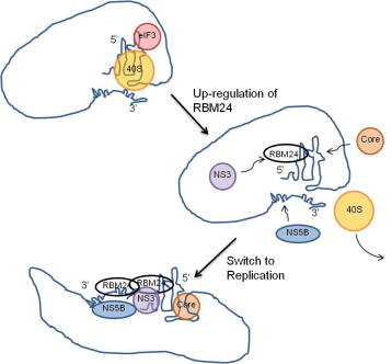 假设工作模型,HCV基因组RNA上结合了核糖体和eIF3,以及一些宿主因子来使得HCV RNA成环进行翻译。RBM24上调以后,RBM24与40S核糖体竞争结合IRES,同时招募NS3和Core到HCV RNA上,在RBM24、NS3和Core蛋白以及其它宿主因子的协同作用下,切换到一个利于RNA转录的一个构象形式。