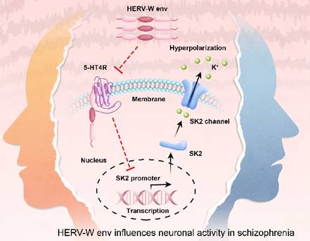 本研究在临床样本检测中发现了5-羟色胺能受体4(5-HT4R)在精神分裂症中低表达,且与HERV-W env的表达呈负相关。细胞学实验证实,HERV-W env可与5-HT4R相互作用,下调5-HT4R的表达,导致小电导钙激活钾通道2(SK2)上调。荧光素酶实验显示SK2启动子-364~-176区是HERV-W env诱导SK2表达的核心区域。此外,膜片钳实验表明,HERV-W env可增加SK2通道电流,而5-HT4R抑制SK2通道电流的增加。这些结果揭示,HERV-W env可降低5-HT4R的表达水平,激活SK2通道,影响神经元的兴奋性,进而参与精神分裂症的发生与发展过程。