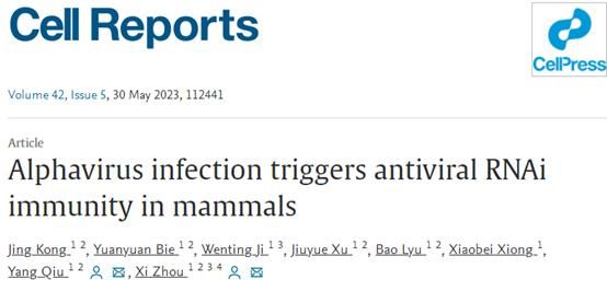 2023年4月,病毒学国家重点实验室周溪/邱洋团队在国际学术期刊Cell Reports发表了题为“Alphavirus infection triggers antiviral RNAi immunity in mammals”的研究论文。该研究首次发现野生型甲病毒感染哺乳动物体细胞及成年小鼠可以有效激发RNA干扰(RNAi)介导的抗病毒免疫,拓展了我们对哺乳动物中RNAi抗病毒免疫的认识。