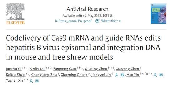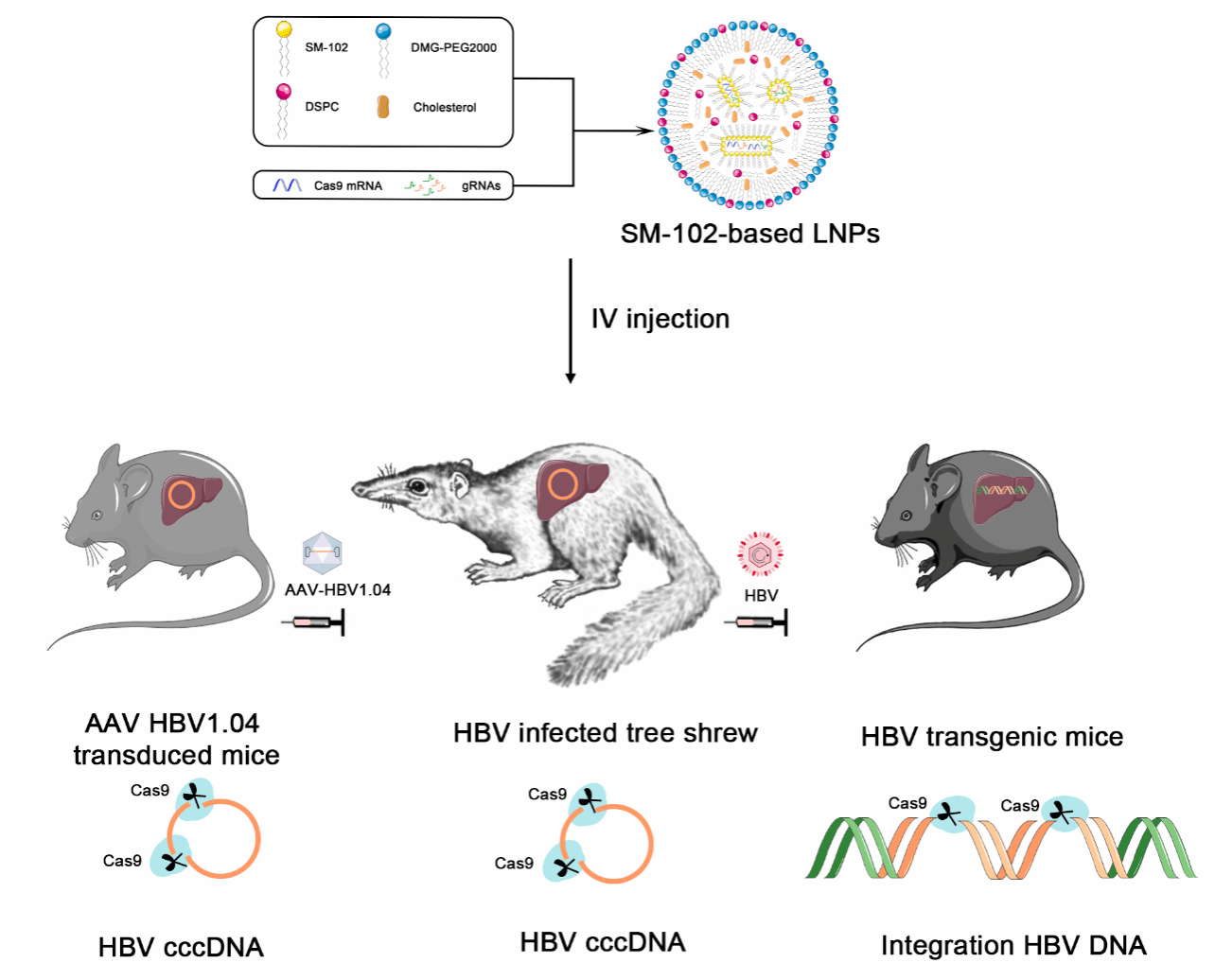 近日,病毒学国家重点实验室夏宇尘教授与武汉大学医学研究院殷昊教授、昆明动物所林江维研究员合作在国际学术期刊Antiviral Research在线发表题为“Codelivery of Cas9 mRNA and guide RNAs edits hepatitis B virus episomal and integration DNA in mouse and tree shrew models”的研究论文。该研究利用脂质纳米颗粒(SM-102-based LNPs)递送Cas9 mRNA和gRNA完成基因编辑。在AAV HBV1.04小鼠、HBV转基因小鼠和HBV感染树鼩体内,该mRNA脂质纳米颗粒可以安全有效地编辑乙肝病毒(HBV)微染色体cccDNA和整合的HBV基因组,为CRISPR/Cas9系统开展乙型肝炎的基因治疗提供理论依据和技术支持。