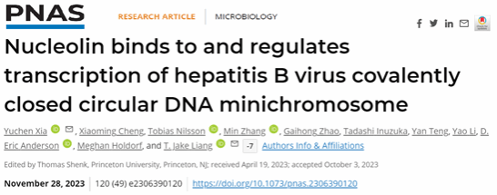 近日,病毒学国家重点实验室/武汉大学泰康医学院(基础医学院)/泰康生命医学中心夏宇尘教授课题组在国际学术期刊The Proceedings of the National Academy of Sciences (PNAS)发表题为“Nucleolin Binds to and Regulates Transcription of Hepatitis B Virus Covalently Closed Circular DNA Minichromosome”的研究论文。该研究使用一系列技术手段分离乙型肝炎病毒(hepatitis B virus,HBV)微染色体cccDNA,利用免疫沉淀-液质联用质谱技术和siRNA筛选出其关键调控因子核仁素(Nucleolin, NCL)并进一步解析了其作用机制。