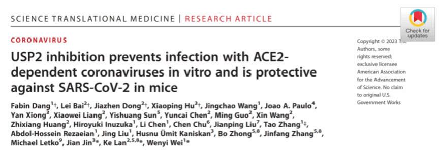 2023年12月6日,哈佛大学医学院魏文毅团队、武汉大学病毒学国家重点实验室蓝柯团队和西奈山医学院金坚团队合作在SCIENCE Translational Medicine在线发表了题为 “USP2 inhibition prevents infection with ACE2-dependent coronaviruses in vitro and is protective against SARS-CoV-2 in mice” 的研究论文。研究发现,USP2是ACE2的去泛素化酶,通过抑制USP2可以降低ACE2蛋白水平,从而阻断SARS-CoV-2对细胞和小鼠的感染。研究结果还表明,通过抑制USP2降低ACE2蛋白水平可以有效抵抗其它多种利用ACE2作为受体进行感染的冠状病毒,表明这是一种广谱的抗病毒策略。研究团队进一步研发了一种可以口服的USP2抑制剂MS102,对ACE2依赖的冠状病毒表现出有效的抗病毒活性。此外,MS102在体内具有良好的药代动力学特性和抗病毒活性,有望进一步发展成为治疗依赖ACE2的病毒感染的抗病毒手段。