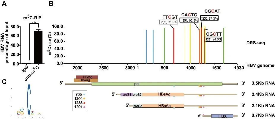 图1:HBV RNA存在m5C修饰。 A. RIP证明HBV RNA存在m5C修饰;B. m5C修饰在HBV转录本的分布图;C.m5C修饰分布的基序图