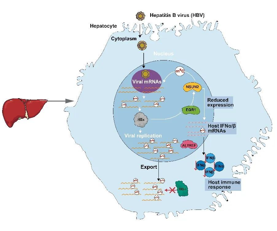 研究发现,m5C结合蛋白ALYREF能够识别并结合病毒转录本上的特定位点nt 1291,从而促进病毒mRNA的核输出和蛋白翻译,并帮助病毒逃避宿主RIG-I蛋白的识别从而抑制干扰素及其刺激基因的产生。此外,研究还发现HBV通过调节m5C甲基转移酶NSUN2的表达,进一步影响宿主RNA的m5C修饰水平,其中包括抗病毒免疫通路相关基因的修饰,最终抑制I型干扰素的产生。特别地,研究指出HBV病毒蛋白HBx通过抑制EGR1的表达,进而影响NSUN2的RNA转录,从而导致宿主RNA整体m5C修饰水平的下降。