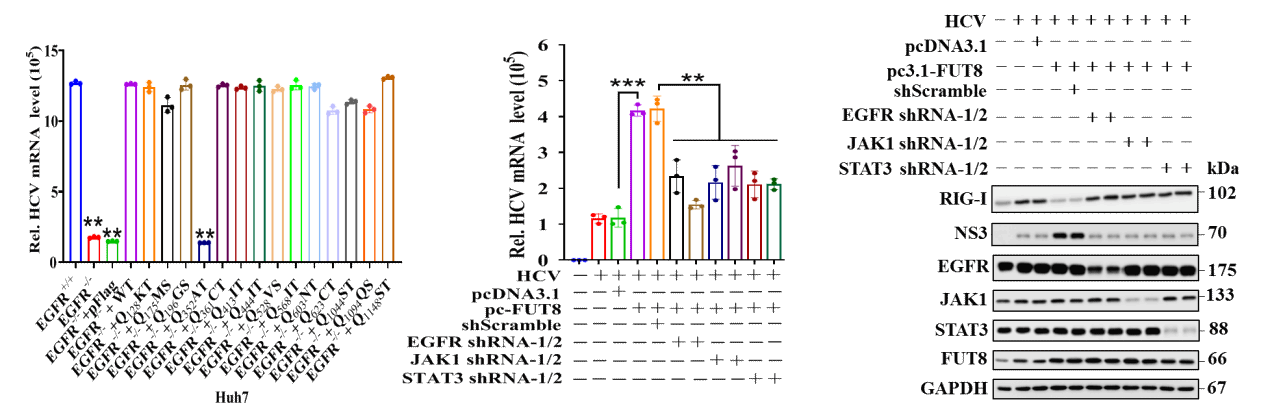 图3. FUT8 通过提高EGFR核心岩藻糖修饰和p-EGFR-p-JAK1-p-STAT3通路活化,促进HCVRNA复制