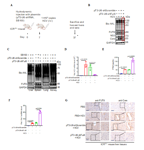 图4. 在HCV四个受体的人源化转基因小鼠ICR4R+的HCV感染模型中,肝脏靶向敲低或过表达Fut8,可以抑制或促进HCV在体内复制和表达