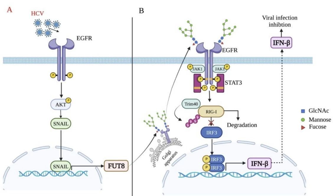 图5. HCV 通过EGFR-AKT-SNAIL通路促进FUT8表达以及FUT8通过EGFR-JAK1-STAT3通路促进HCV的复制示意图
