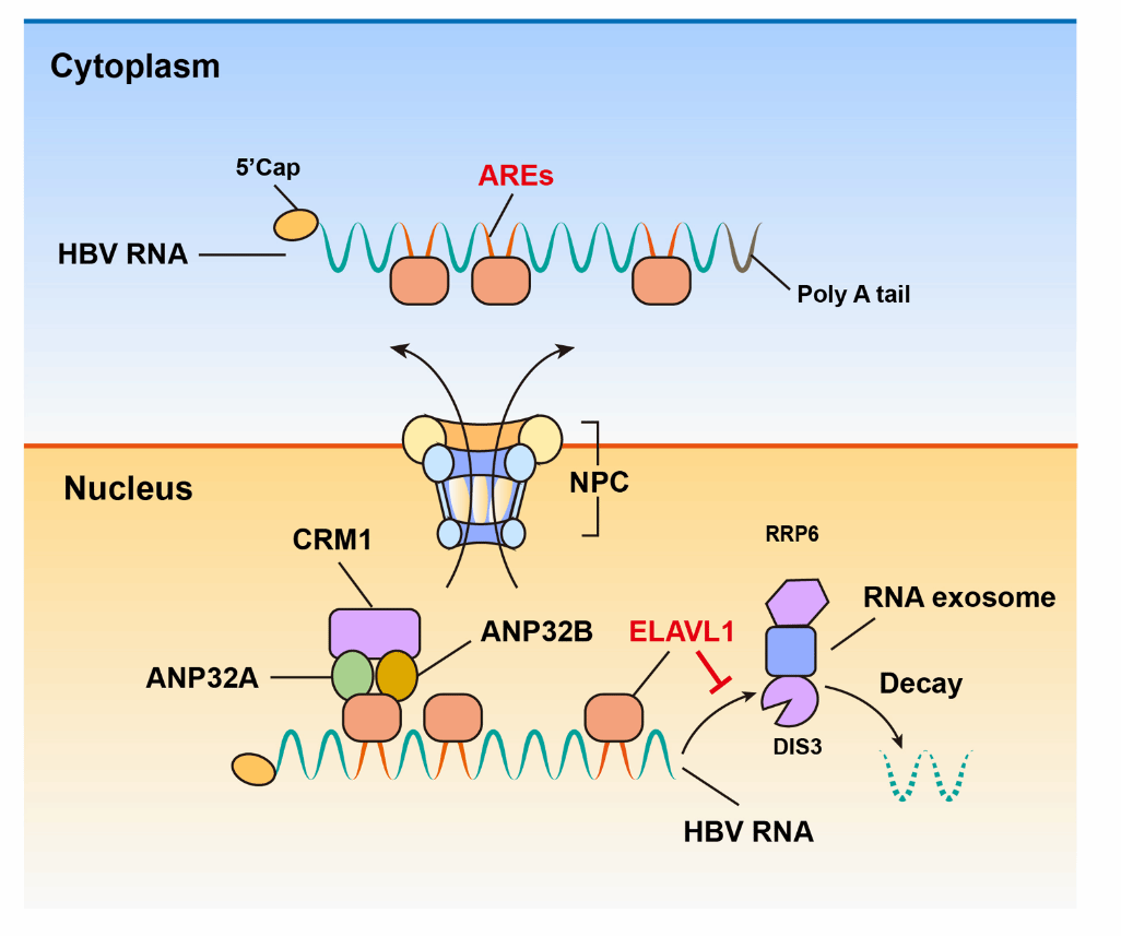 综上所述,研究者发现ELAVL1通过CRM1途径将HBV RNA从细胞核“护送”至细胞质。ELAVL1通过病毒RNA中的ARE元件与HBV RNA结合,进而与ANP32A和ANP32B相结合,将出核信号传递给CRM1,将病毒RNA从细胞核运出。通过与HBV RNA结合,ELAVL1还保护病毒RNA免受DI3+RRP6+ RNA exosome降解的影响。