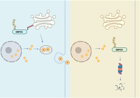示意图:KSHV病毒蛋白ORF55棕榈酰化修饰后定位于高尔基体,促进病毒的二次包膜组装过程。当ORF55不能被棕榈酰化修饰时,失去了定位于高尔基体的能力,而定位于细胞质,同时受到高度泛素化修饰,进入蛋白酶体降解。