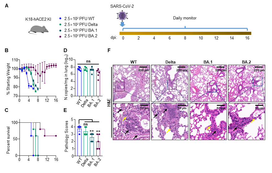SARS-CoV-2自2019年底暴发以来,持续传播与变异并导致突变株(Alpha、Beta、Gamma、Delta和Omicron)的出现,这些突变株的在人群中表现出了不同的致病性。研究人员进一步在K18-hACE2 KI小鼠中评估了SARS-CoV-2 WT、Delta、Omicron BA.1和Omicron BA.2等毒株的致病性。与感染WT病毒的小鼠相比,感染Delta或Omicron BA.1的小鼠从4 dpi开始体重明显下降,大约延迟了2天,而感染Omicron BA.2小鼠从6 dpi开始体重明显下降。感染BA.2的小鼠有40%在12 dpi时死亡,其余存活。不同毒株感染小鼠的肺部病毒载量在终点时没有显著差异。病理分析发现,在WT、Delta、BA.1和BA.2感染小鼠肺部,肺血管周围均有单核细胞、中性粒细胞和淋巴细胞浸润,肺泡壁细胞变性,但BA.1感染和BA.2感染的肺部炎症细胞数量和肺泡壁厚度明显少于WT感染的肺部,提示SARS-CoV-2的致死率与严重的肺部病理和炎症反应密切相关(图3)。