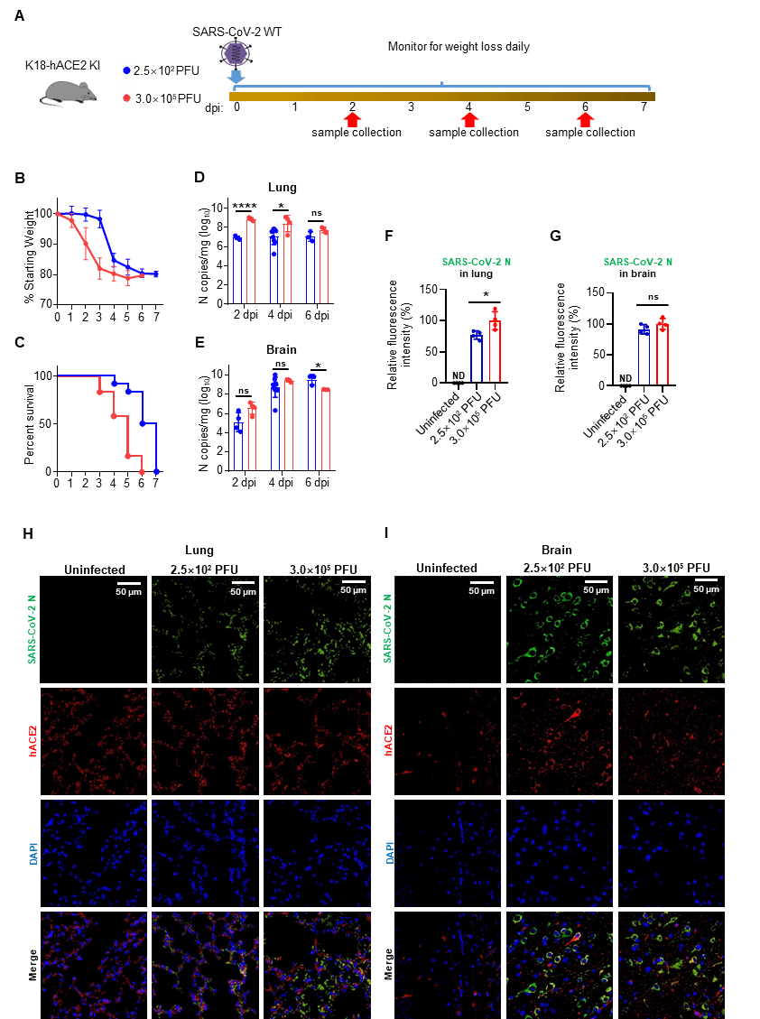 研究人员通过多个采样点,进一步表征了SARS-CoV-2 WT在K18-hACE2 KI小鼠中的致病机制。实验结果显示,SARS-CoV-2可以在K18-hACE2 KI小鼠的肺和脑中建立强大而稳定的感染和复制,在250-3x105PFU的感染范围内,SARS-CoV-2 WT感染的致死率均为100%(图2)。组织学分析表明,随着感染的进展,K18-hACE2 KI小鼠的肺炎由轻到重逐渐发展,而小鼠的脑部未发现明显的组织损伤。进一步检测结果显示,感染SARS-CoV-2的K18-hACE2 KI小鼠在肺部出现了严重的炎症细胞因子和趋化因子反应,且呈感染剂量依赖性,与肺部病理特征一致。相比之下,小鼠在大脑中表现出较弱的炎症细胞因子反应和较强的趋化因子反应,但是没有可检测到的脑部病理改变。研究人员推测在K18-hACE2 KI小鼠中,组织特异性病理和免疫反应主导了疾病的严重程度。SARS-CoV-2在K18-hACE2 KI小鼠中的致死率与严重的肺部病理和肺部炎症反应密切相关。