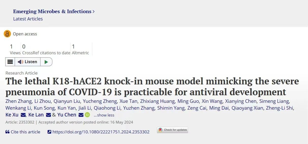 近日,武汉大学病毒学国家重点实验室陈宇/蓝柯/徐可研究组合作,在国际学术期刊Emerging Microbes & Infections在线发表了题为“The lethal K18-hACE2 knock-in mouse model mimicking the severe pneumonia of COVID-19 is practicable for antiviral development”的研究论文,报道了一种新型K18-hace2敲入(KI)转基因小鼠模型。论文系统地比较了三种hACE2基因工程小鼠(K18-hACE2 KI、K18-hACE2 Tg和HFH4-hACE2 Tg小鼠)感染SARS-CoV-2后的症状,并在K18-hACE2 KI小鼠中评估了SARS-CoV-2 WT、Delta和Omicron等毒株的致病性,同时也评估了该小鼠模型在抗新冠病毒药物和疫苗开发中的适用性。