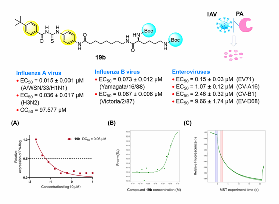 图1. 19b的抗病毒活性与靶向PA降解能力。(A) 19b对PA的降解活性。(B, C) MST实验验证19b与PA的亲和力。