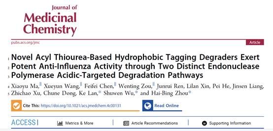 2024年5月23日,武汉大学病毒学国家重点实验室周海兵等在国际学术期刊Journal of Medicinal Chemistry在线发表了题为“Novel Acyl Thiourea based Hydrophobic Tagging Degraders Exert Potent Anti-influenza Activity through Two Distinct Endonuclease Polymerase Acidic Targeted Degradation Pathways” 的研究工作。该研究利用靶向蛋白质降解(Targeted Protein Degradation, TPD)技术,首次将疏水标签(Hydrophobic Tagging, HyT)引入到病毒蛋白降解剂的设计中,合成得到一类基于酰基硫脲骨架的新型流感病毒RdRp酸性蛋白(PA)降解剂。所得化合物能显著降解流感病毒PA并抑制病毒复制,且对多种流感病毒亚型具有较好的抑制效果,为抗流感药物的研发提供了新思路与新方法。