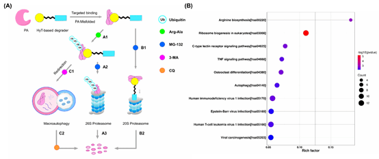图3. 19b通过多种途径诱导PA降解与蛋白组学分析。(A) 19b诱导PA降解可能的通路。(B) 19b诱导PA降解的蛋白组学分析