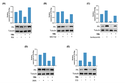 图2. 19b诱导PA降解的机制研究。RA (A), MG132 (B), 硼替佐米 (C), 3MA (D)和CQ (E)对19b诱导PA降解的影响。