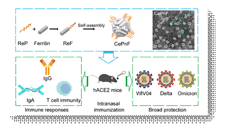 以往的研究在未感染新冠病毒的人体中发现了可以识别SARS-CoV-2的预存中和抗体,这些抗体对应靶向S蛋白S2亚基的保守表位(Ng KW et al,Science,2020, 370, 1339)。本研究中,研究人员将预存中和抗体对应的多个S2保守抗原表位(如S810-816、S817-824、S851-856等)与幽门螺旋杆菌铁蛋白融合表达,基于铁蛋白自组装制备了一种表面展示SARS-CoV-2保守抗原表位的铁蛋白纳米颗粒CePnF。CePnF纳米颗粒经滴鼻免疫小鼠后,能诱导产生强大的体液、细胞、粘膜免疫反应,并产生持久的免疫效应。CePnF诱导产生的抗体对不同的冠状病毒(CoV)及新冠变异株表现出交叉反应和中和活性。进而,CePnF纳米颗粒免疫接种hACE2转基因小鼠,能显著抑制新冠病Delta毒株、WIV04毒株和Omicron毒株的感染和致病,可广泛抵御新冠病毒变异毒株的感染。