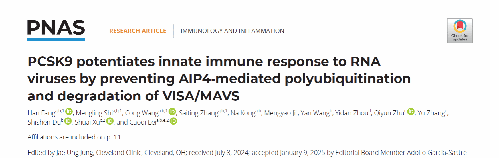 近日,高致病性病毒与生物安全全国重点实验室/武汉大学生命科学学院雷曹琦研究组在Proceedings of the National Academy of Sciences of the United States of America(PNAS)上发表了题为“PCSK9 potentiates innate immune response to RNA viruses by preventing AIP4-mediated polyubiquitination and degradation of VISA/MAVS”的研究论文,揭示了PCSK9调控病毒感染与宿主免疫反应的新机制。