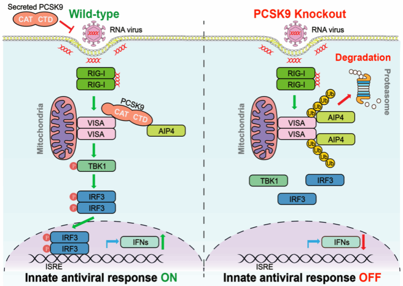 总之,该研究首次发现胞内PCSK9竞争性抑制E3泛素连接酶AIP4对VISA的泛素化修饰与降解,并揭示了PCSK9在细胞内外调节宿主抗RNA病毒的双重作用机制,这有助于阐明代谢和免疫反应之间的联系,并为病毒感染和自身免疫性疾病的治疗提供策略。