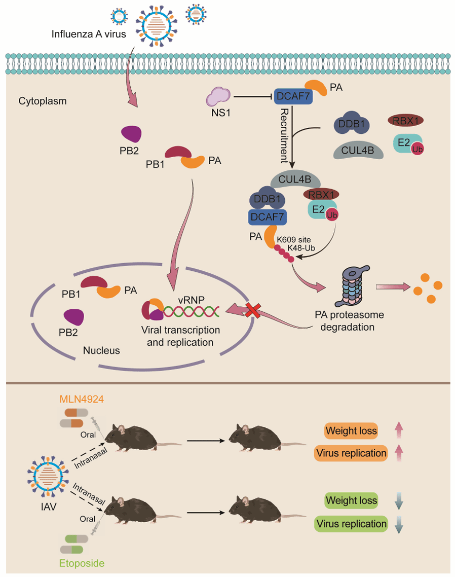 该研究通过质谱数据分析和克隆表达筛选鉴定出宿主抗IAV感染的限制因子DCAF7。过表达、小分子干扰RNA敲低和敲除回补感染实验证实DCAF7能显著抑制流感病毒H1N1和H3N2的复制。进一步研究发现,DCAF7通过与病毒聚合酶亚基互作并特异性降解PA,进而降低病毒RdRp的活性,限制IAV的复制和转录。而且,DCAF7不影响聚合酶PB1和PB2亚基的稳定性。DCAF7作为底物识别受体,与CRL4B E3复合物形成完整的CRL4BDCAF7E3泛素连接酶,促进病毒聚合酶PA亚基K609位点的K48多聚泛素化及降解。特异性的Cullin-RING E3连接酶(CRLs)抑制剂MLN4924能够上调PA的蛋白水平和病毒聚合酶活性,并在小鼠体内促进IAV的复制,造成更严重的肺组织损伤。相反地,Etoposide(依托泊苷)能够激活CUL4B并促进PA的泛素结合及降解,并在体内外抑制IAV的复制,从而减轻病毒导致的小鼠肺组织损伤。有趣的是,在IAV感染过程中,病毒编码的NS1蛋白能下调DCAF7的表达,从而拮抗宿主的抗病毒作用,维持病毒自身复制。