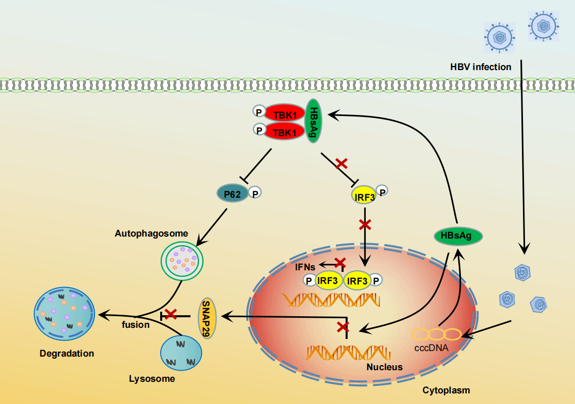 HBV是一种嗜肝性的DNA病毒,可引起急性感染或慢性感染,进而发展成为不同程度的肝炎、肝硬化甚至肝癌。在前期的研究中,朱应、刘实团队发现,HBV感染机体后利用多种策略逃避宿主天然免疫系统识别;另一方面,HBV 的感染激活自噬并利用自噬促进病毒复制。在本研究中,该团队进一步探索了HBV调控宿主天然免疫应答和细胞自噬之间的分子机制。
