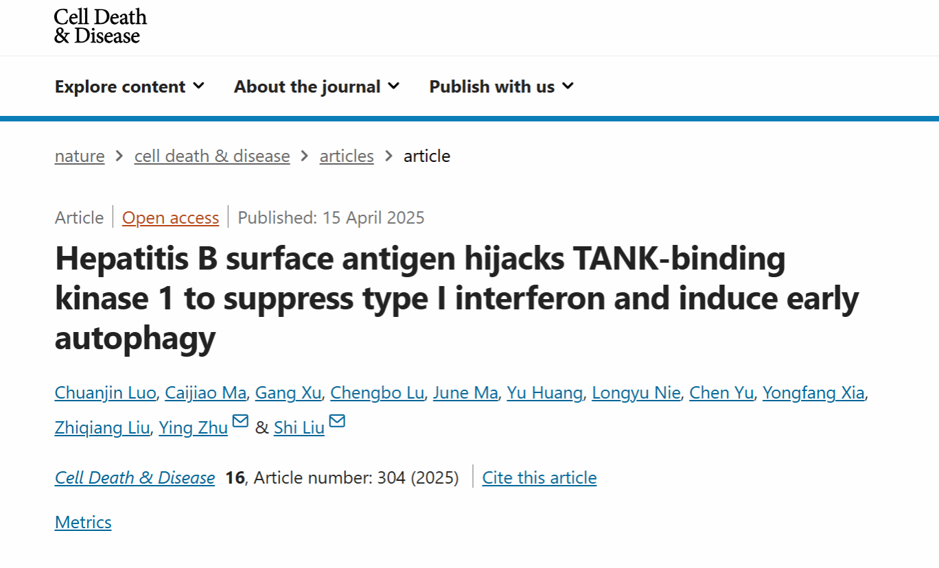 2025年4月15日,国际学术期刊Cell Death & Disease在线发表了高致病性病毒与生物安全全国重点实验室/武汉大学生命科学学院朱应、刘实团队的最新研究成果,论文题为“Hepatitis B surface antigen hijacks TANK-binding kinase 1 to suppress type I interferon and induce early autophagy”。 该研究工作揭示了乙型肝炎病毒表面抗原(HBsAg)通过劫持 TANK 结合激酶1(TBK1)抑制 I 型干扰素的产生并促进早期阶段自噬小体的积累, 为进一步理解乙型肝炎病毒(HBV)感染过程中宿主天然免疫应答和细胞自噬之间的相互关系提供了新的思路