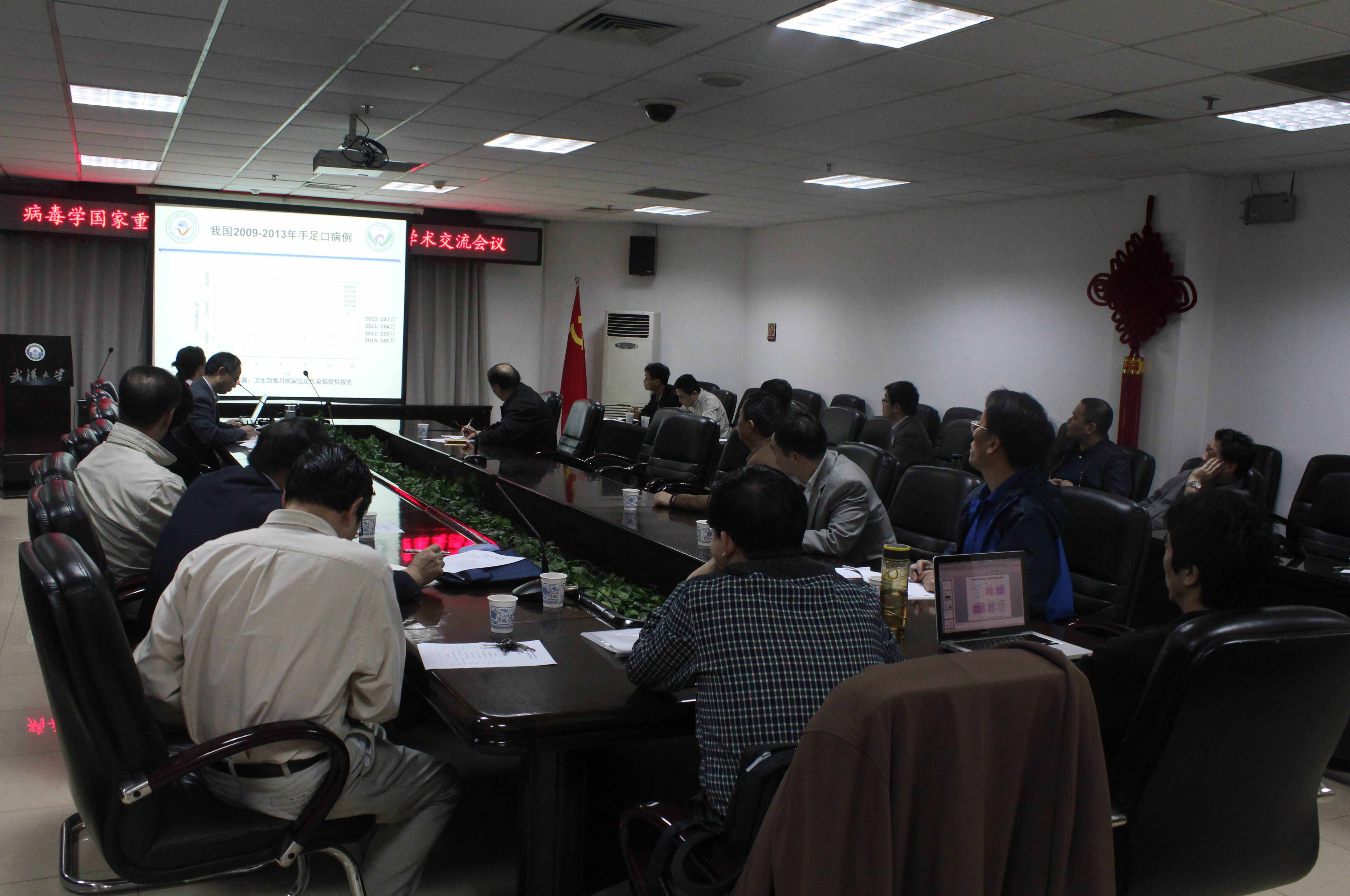 首先胡志红研究员根据我国2009年~2013年手足口病例的分布从手足口病死亡病例的临床症状、死亡病例的病理及病毒学检测方面和EV71致死病例的病理变化等方面就EV71致死病例的病理及毒株分析作出相关报告。吴建国教授、肖庚富研究员、潘兹书教授等分别从致死病例的获得,取样和毒株的分离等方面一一与胡志红研究员作了深入交流与探讨。接着侯伟教授和杨占秋教授就肾综合征出血热与基因多态性和新亚型汉坦病毒的致病性研究方面分别进行了报告;杨荣阁教授和刘映乐教授就HIV仍处于突变进化活跃期以及人类免疫缺陷病毒(HIV-1)抗凋亡调控机制研究汇报了实验室的近期研究进展;龚鹏教授介绍了乙型脑炎病毒非结构蛋白NS5的功能研究。他们与大家分享了近期取得的一些成果,更重要的是一起探讨了不足和改善方法。葛行义副研究员代表石正丽课题组做了题为蝙蝠病毒的发现与分离鉴定、遗传进化规律研究的报告。他介绍了蝙蝠作为寄主从群体和个体两方面分析了病毒的种类和个体差异。最后潘兹书教授做了嵌合猪瘟病毒基因组遗传稳定性的报告。潘教授与郑从义、陈明周等教授就实验方案交换了意见和看法。