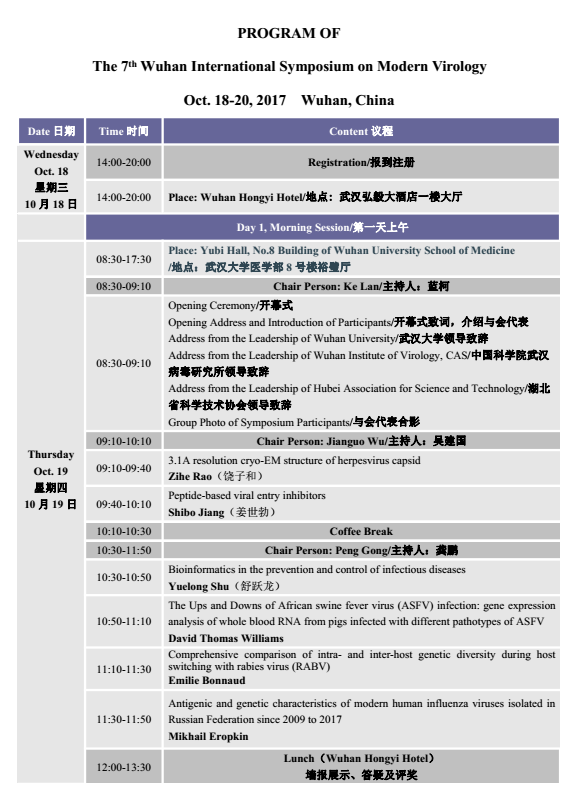 秋高气爽,丹桂飘香,由病毒学国家重点实验室主办,武汉大学、中国科学院武汉病毒研究所、湖北省科学技术协会协办的“第七届武汉现代病毒学国际研讨会”(The 7th Wuhan International Symposium on Modern Virology)于2017年10月18-20日在武汉大学隆重召开,本届会议议题主要聚焦病毒学的前沿热点问题,围绕病毒遗传变异与分子流行病学,病毒与细胞相互作用的分子机理,病毒感染、免疫与致病机理等方面展开。