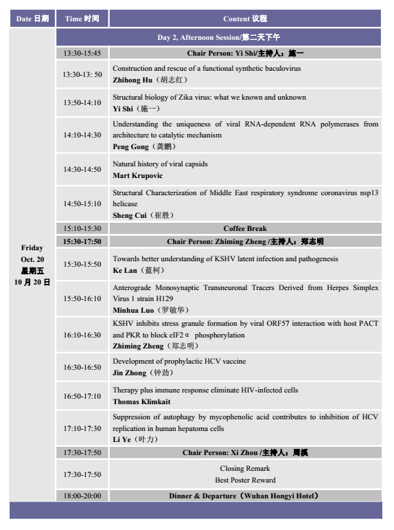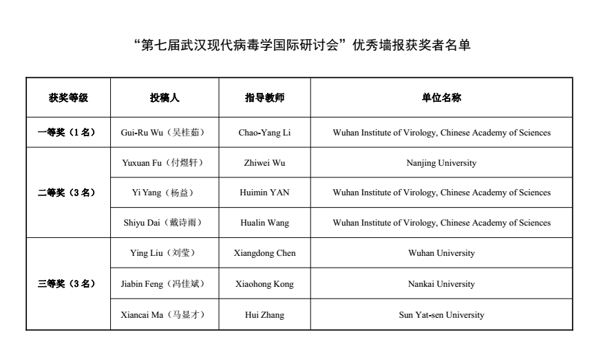 本届会议主席由病毒学国家重点实验室主任蓝柯教授、前主任吴建国教授,中国科学院武汉病毒研究所所长陈新文研究员、前所长胡志红研究员共同担任。会议得到了武汉大学、中国科学院武汉病毒研究所、湖北省科学技术协会、武汉生物技术研究院、湖北省生物工程学会等单位的大力支持。