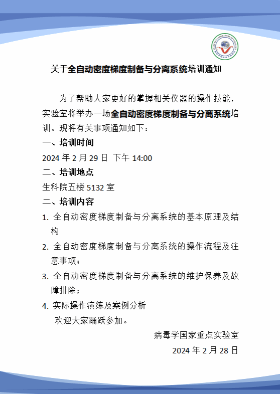 【设备培训】关于全自动密度梯度制备与分离系统培训通知